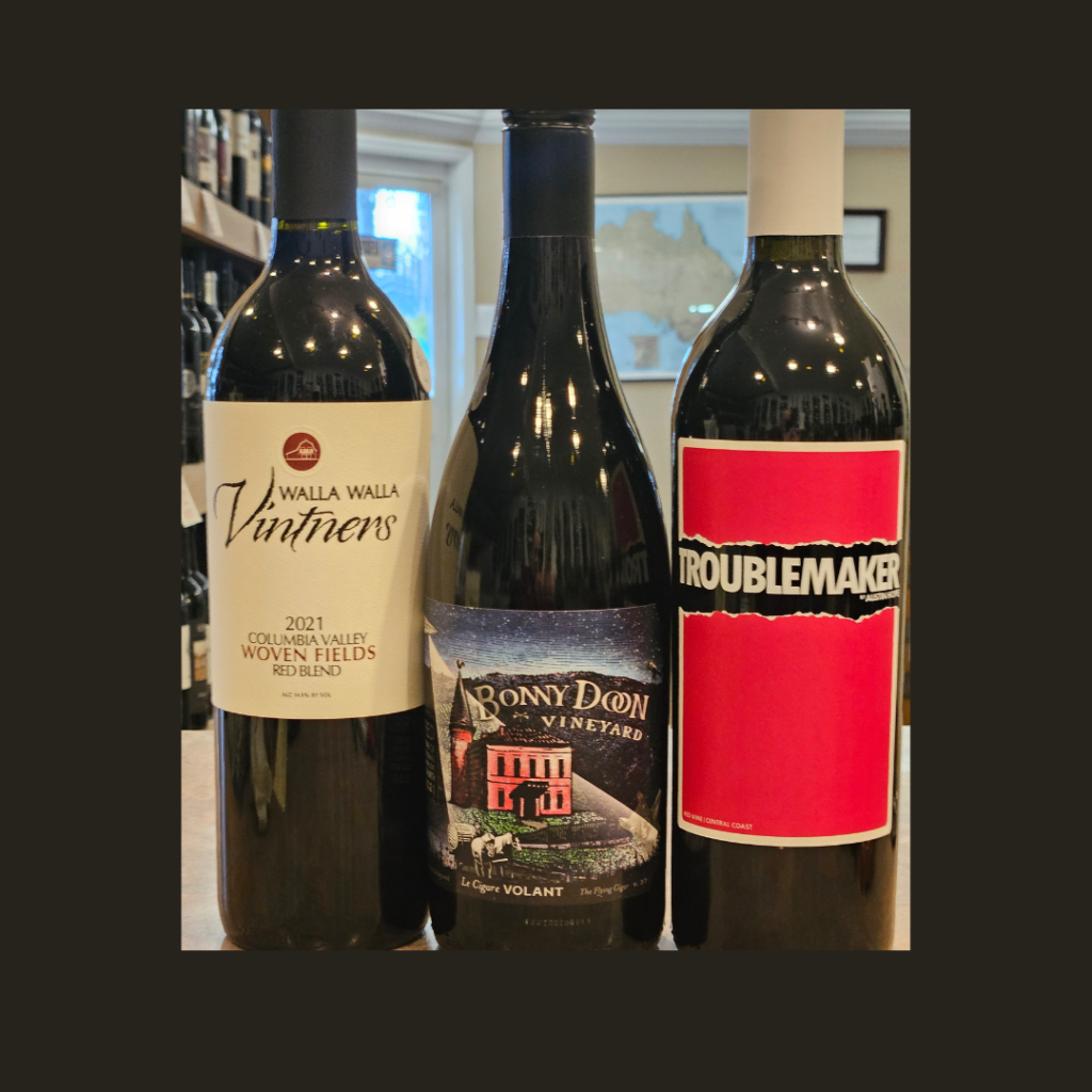 While it is still winter, spring–and grilling season–are in the air. Therefore, we have decided to offer three wines for the featured wines which we feel will be great with grilled items. All three are blends; two from northern California and one from Washington State. These are great just to sip in front of the fire if grilling is not your thing. Two of them are nicely discounted (25% plus). Stop in and pick a bottle or taste a sample in our wine stations.